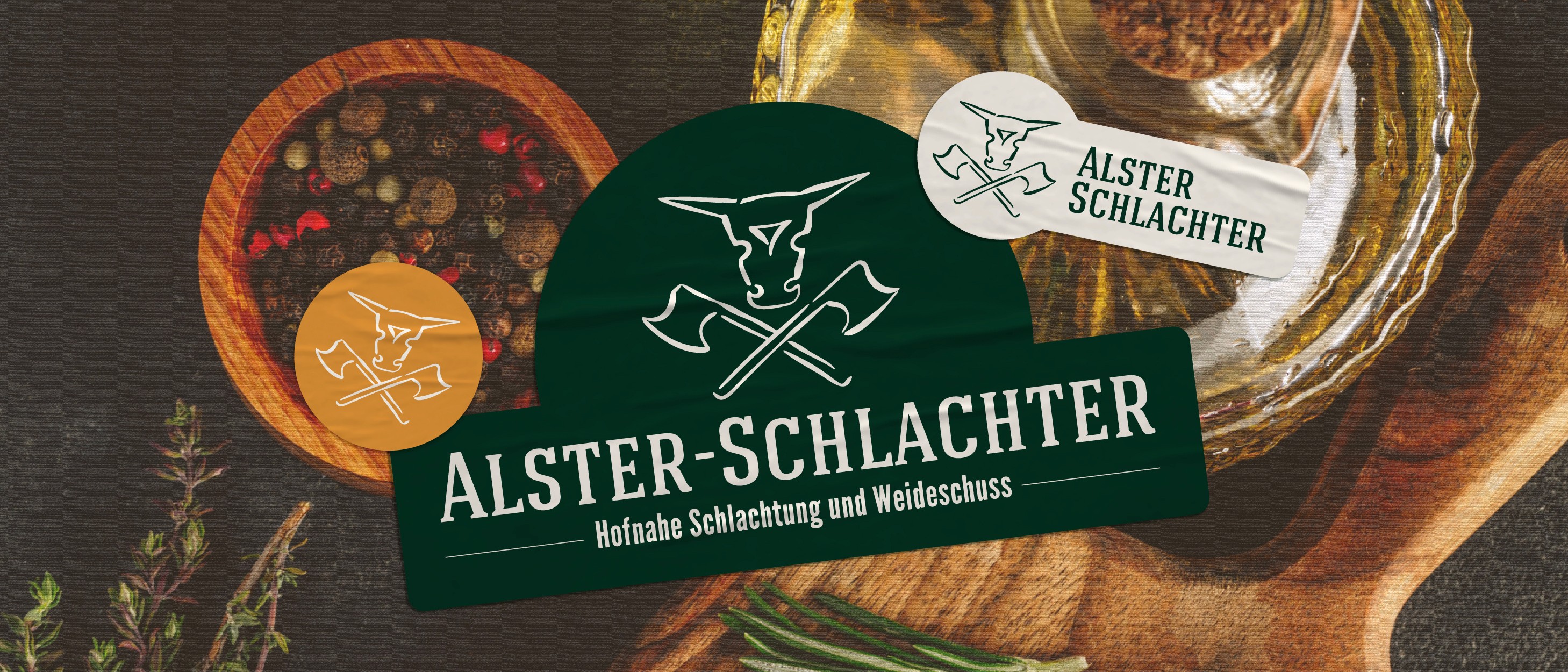 Für den Alster-Schlachter entstand ein neues Branding, das traditionelle Schlachterkunst mit modernem Design verbindet. Als Inspirationsquelle diente das außen am Gebäude angebrachte Schild, das einen direkten Bezug zum Familienbetrieb herstellt.